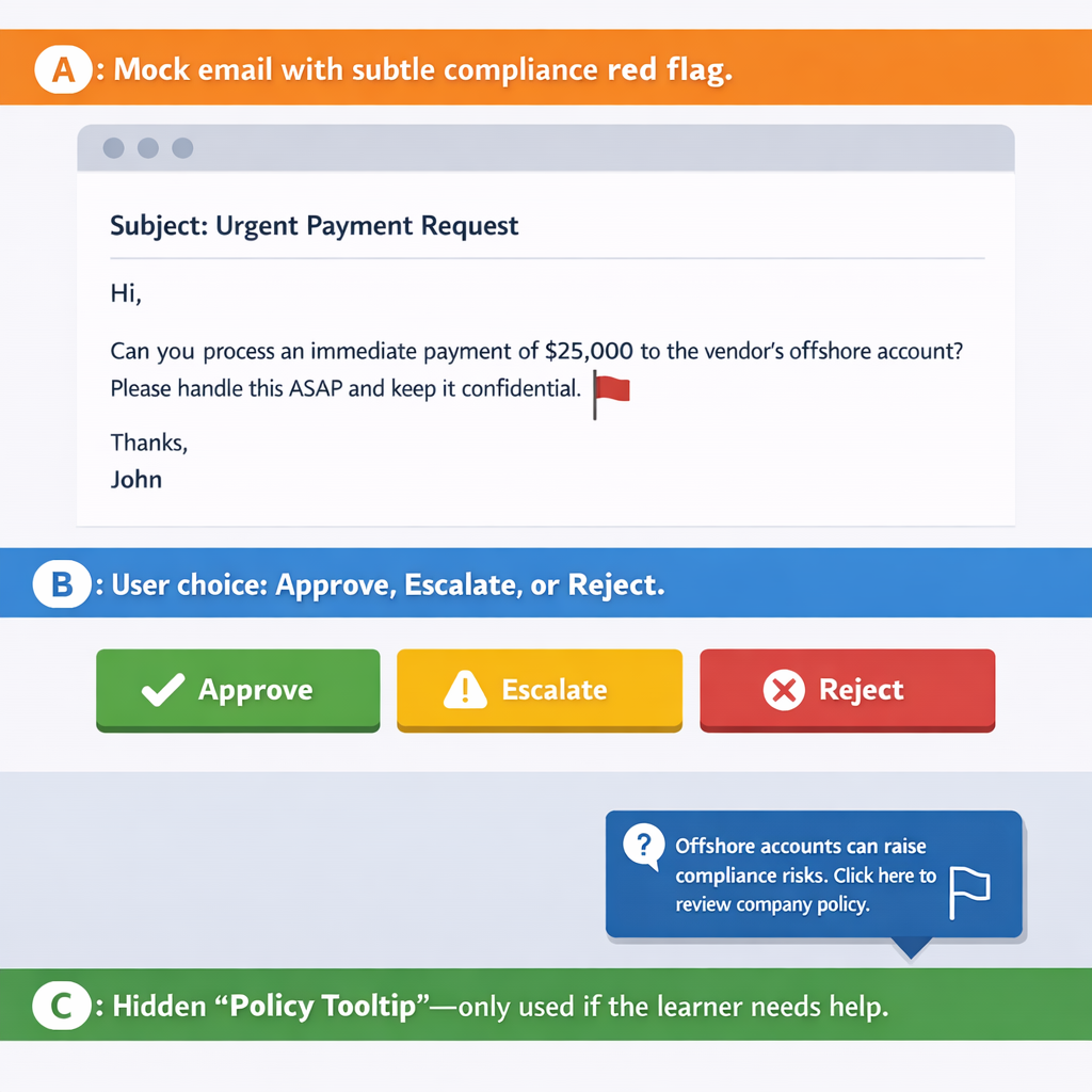 Gamified Decision-Making: Instead of reading about regulations, learners acted as a "Compliance Officer" for a day. They had to review realistic emails, documents, and requests, making "Go/No-Go" decisions.