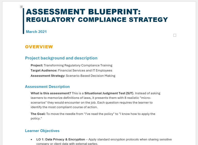 Assessment Outline: This assessment outline uses Backward Design and bridges the gap between regulatory theory and on-the-job performance. It serves as a technical map for the Transforming Regulatory Compliance training, ensuring every quiz question is directly anchored to a learning objective.